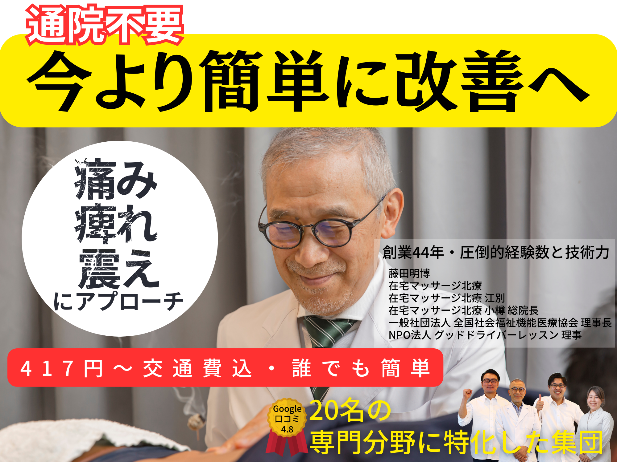 北療では、創業43年・延べ20万人以上の施術実績をもとに、歩行困難や慢性痛、病気の後遺症などに悩む方のために、医療保険が使える訪問マッサージ・在宅リハビリサービスを提供しています。