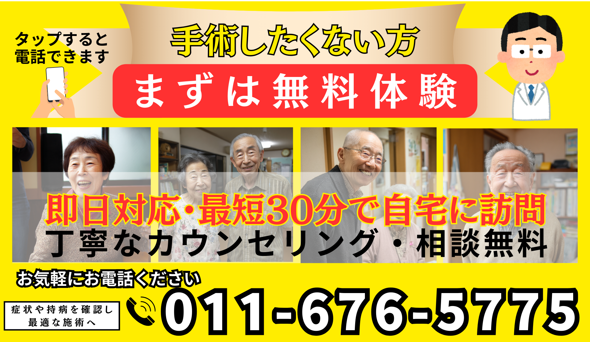 訪問マッサージやはりきゅうって私の症状でも出来るのかな?? 大丈夫です「無料体験やりたい」とお伝えください。丁寧に対応します。011-676-5775こちらにタップしてください 難聴の方や言語障害の方はメールで対応します。